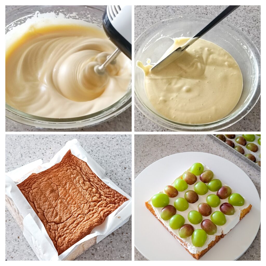 15cmのスクエア型でジェノワーズを焼いて、スライスしたらシロップを染み込ませ、生クリームを塗ったらこんな感じでぶどうを配置🍇