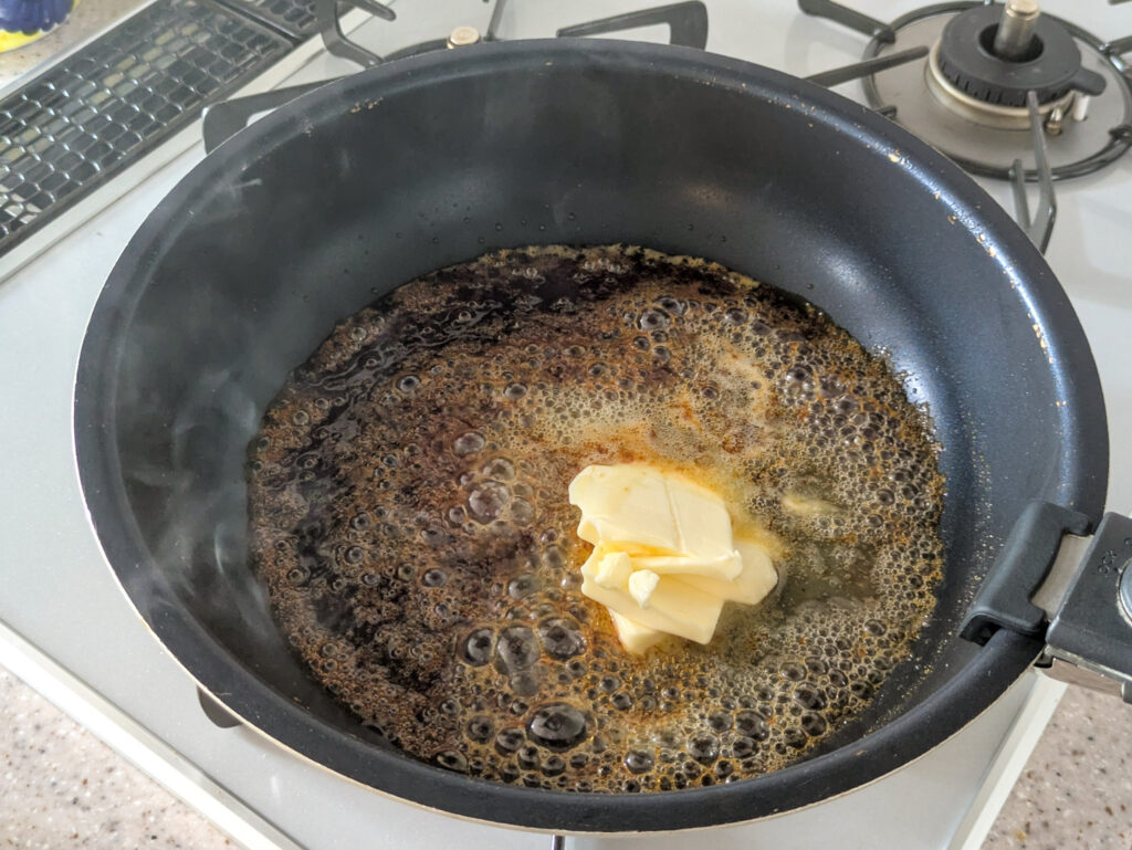 さて、グラニュー糖を焦がして濃いめのカラメルを作ったらバターを溶かし、りんごとレモン果汁を投入