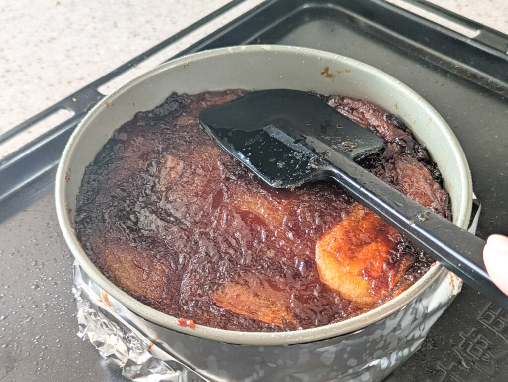 私はいつも底がとれるタイプ15cm丸型を使っていたんだけど、テフロン加工のものじゃないから、油脂を塗ってもどうしてもカラメルが飴化したところはくっついてしまう💦