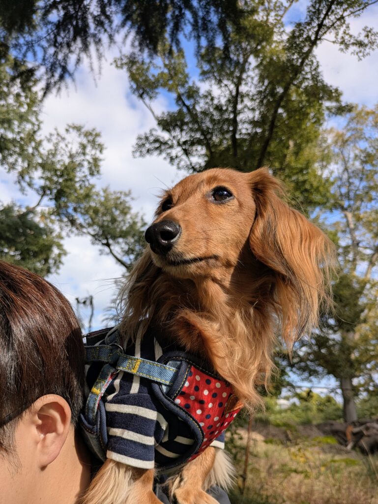 パパの肩に乗ってキリッとした表情🐶