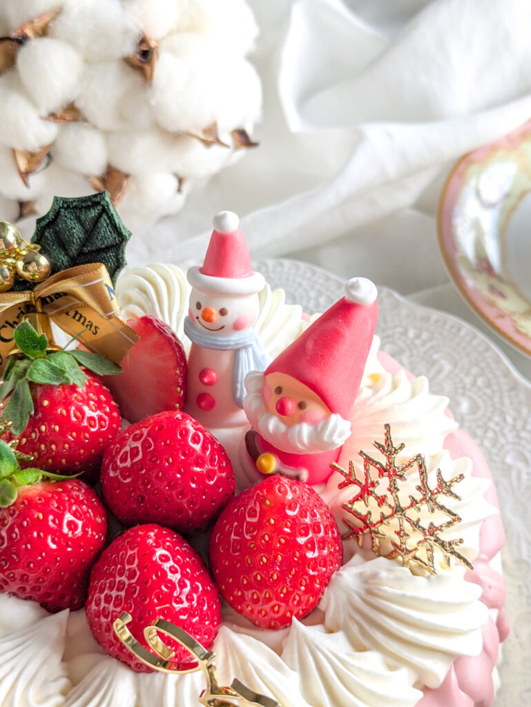 サンタさんとスノーマンの砂糖菓子や、雪の結晶などなどを飾って、Xmasショートケーキの完成⛄️