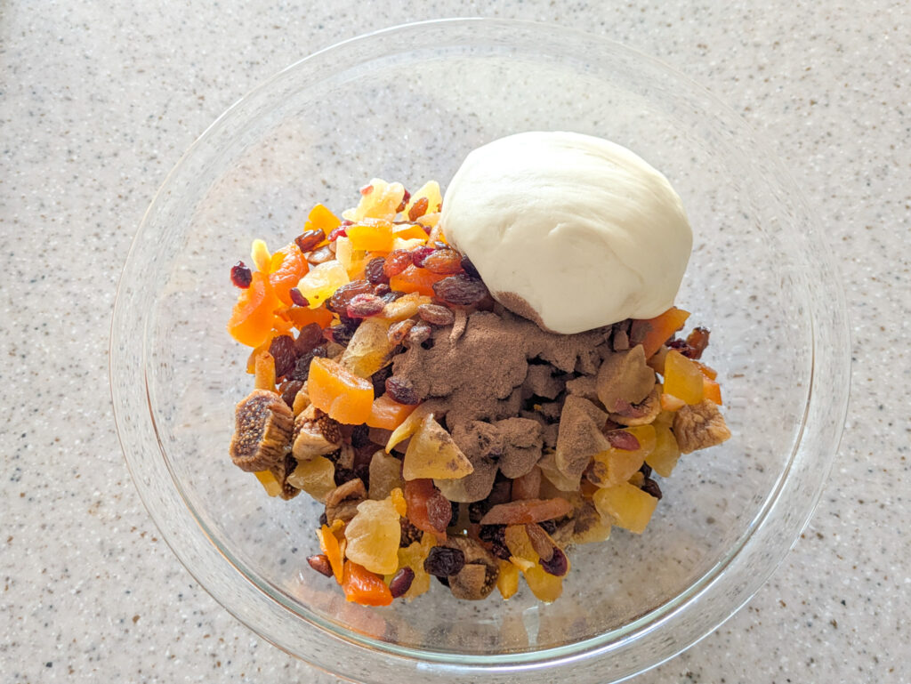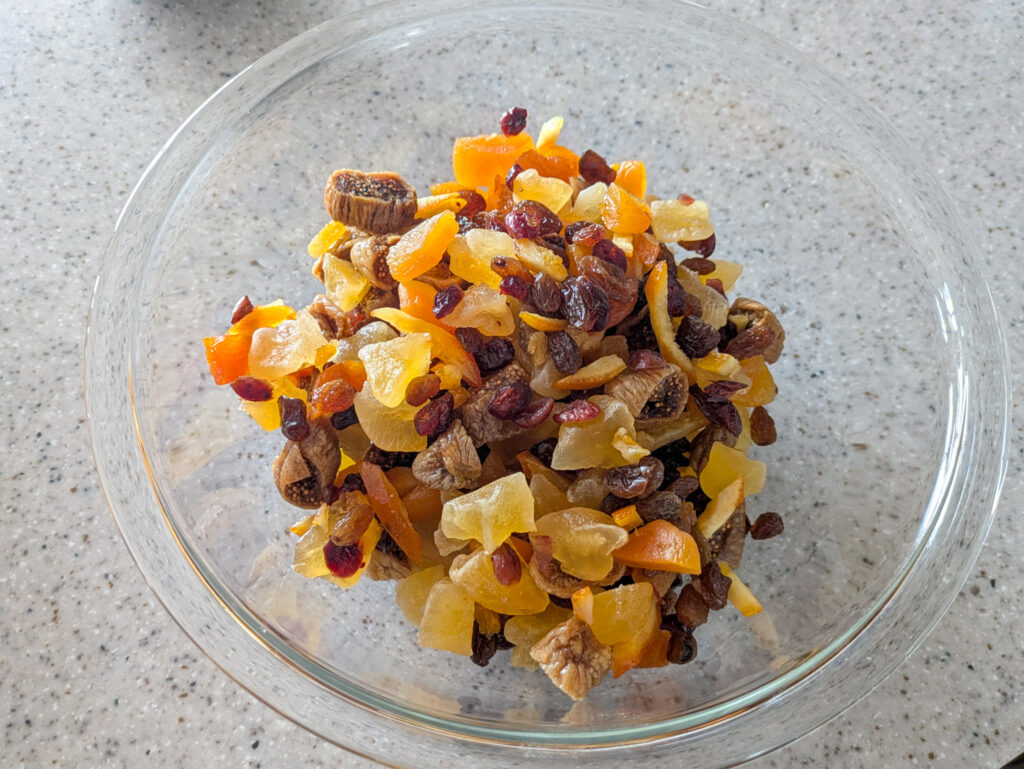 後は、いちじく、アプリコット、クランベリー、レーズン、オレンジピールを入れています