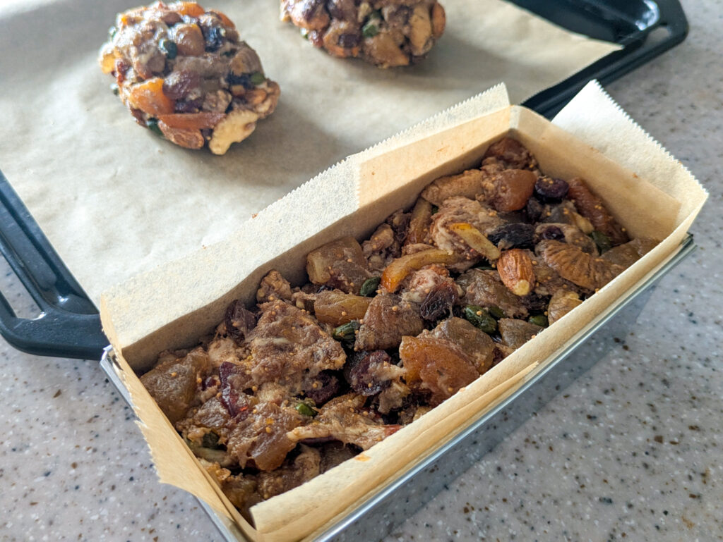 それを隙間ができないように型に詰めて(入りきらなかった分はそのまま丸めて)オーブンの低温で45〜60分焼きます