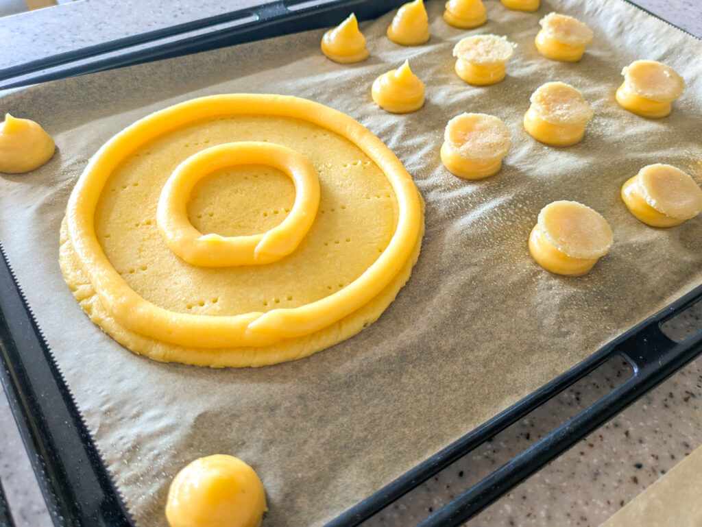 15cmの大きさにカットしたサブレブレトンにシュー生地を絞り、残りの生地は直径2cmくらいの小さな丸に絞り出します