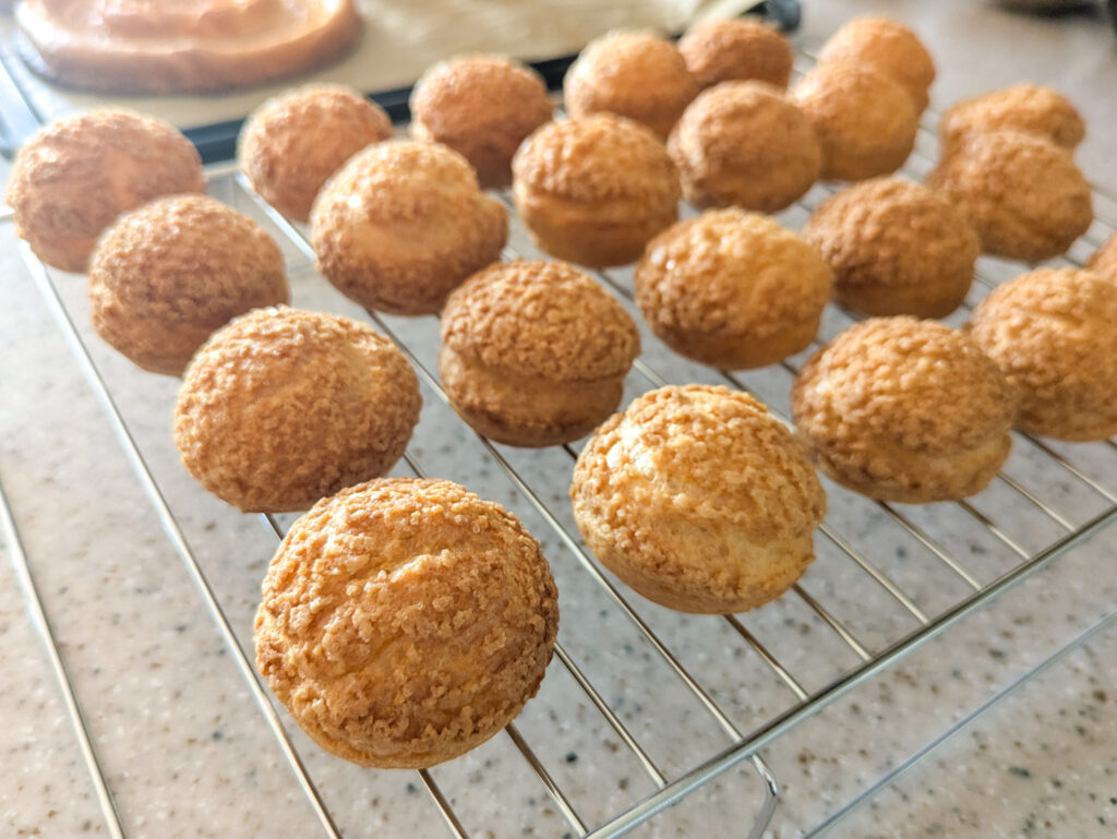 5分経つと、シュー生地は触れるくらいの温かさになっているので、竹串でシュー生地の底に小さい穴を開けて蒸気を逃がし、完全に冷めるまで網の上においておきます