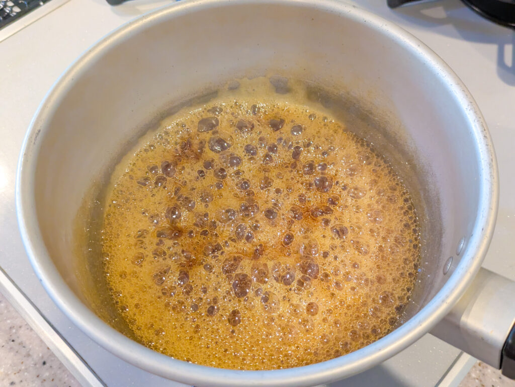 バター、グラニュー糖、塩、牛乳&水を入れた鍋を火にかけて、ぶわっと沸騰したら火からおろします