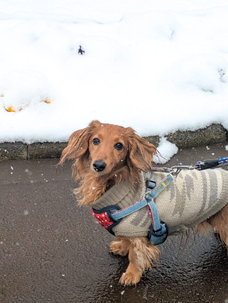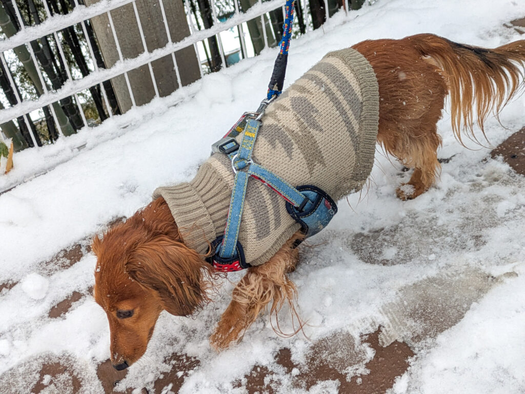 犬生2回目の雪道、最初は忘れていたのかたどたどしい歩き方だったけど、すぐに慣れて雪の日スペシャルクンクンタイムに突入