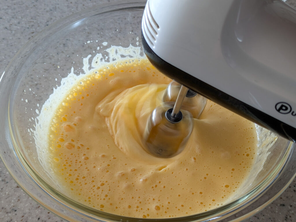 ボウルに卵と砂糖、水飴を入れたらハンドミキサースイッチオン