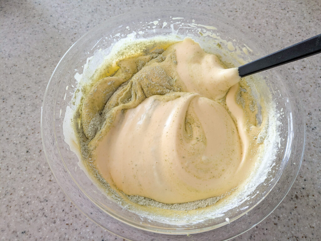 粉類を入れて混ぜ、最後に温めておいたバター+牛乳を加えて生地の完成