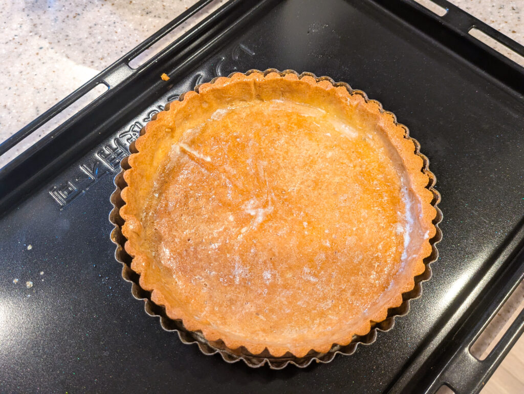 パートシュクレはサクッと空焼きにし、防水のために卵白を塗っておきました