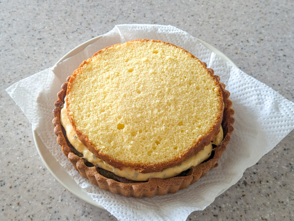 クレームパティシエール、ジェノワーズを重ねます