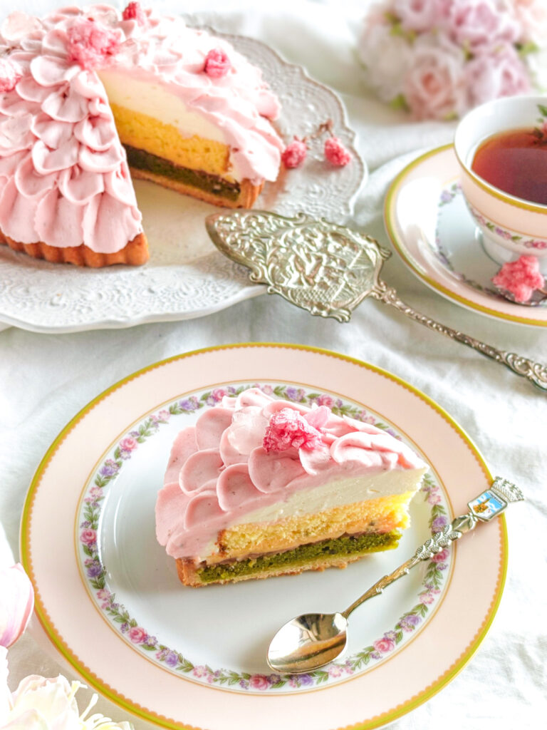 構成としては、パートシュクレ、抹茶のクレームダマンド、桜あん、桜の葉入りのクレームパティシエール、生クリーム、桜ジュレ