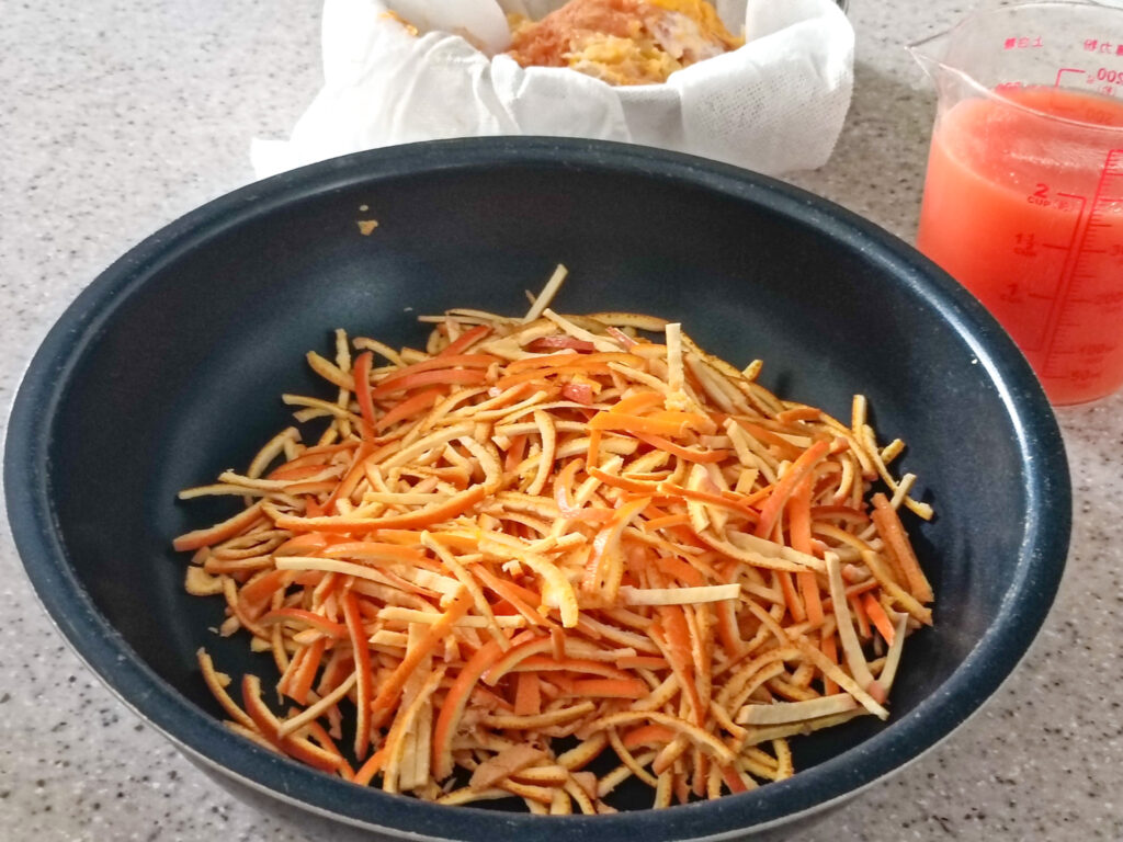 さて、ここがちょっと大変だけど、皮についた薄皮を取って皮を細切りにします