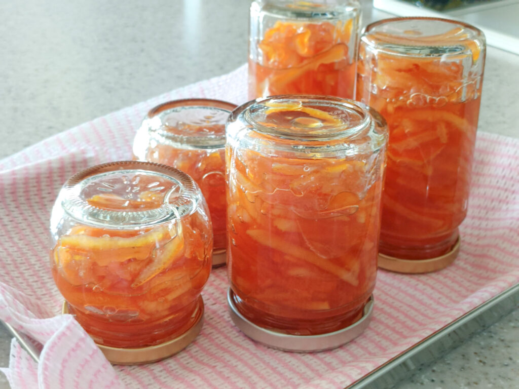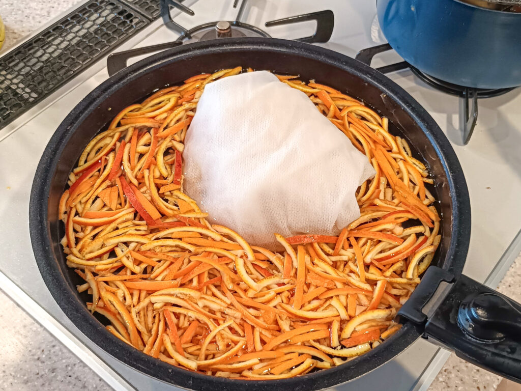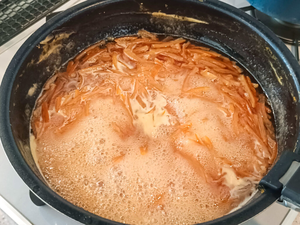 茹でた皮、果汁、煮汁、砂糖を一緒に煮込んで、とろみがついたら出来上がり