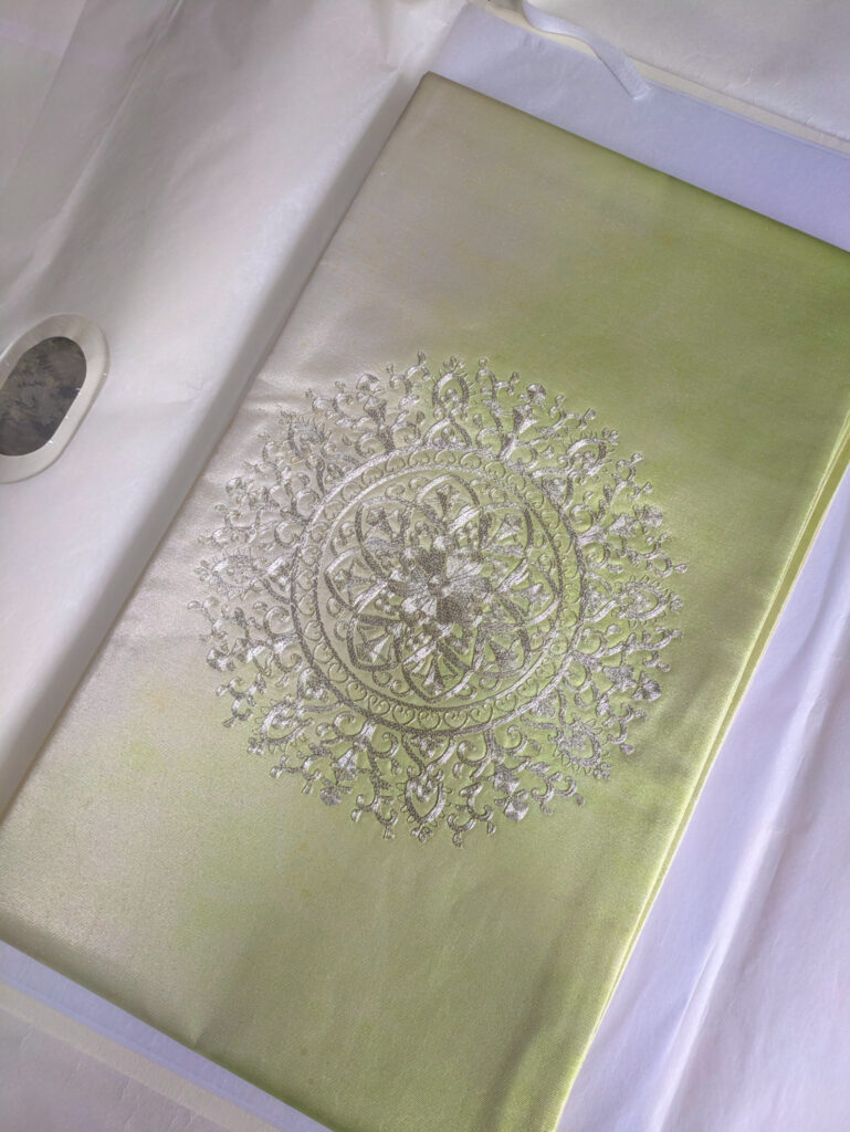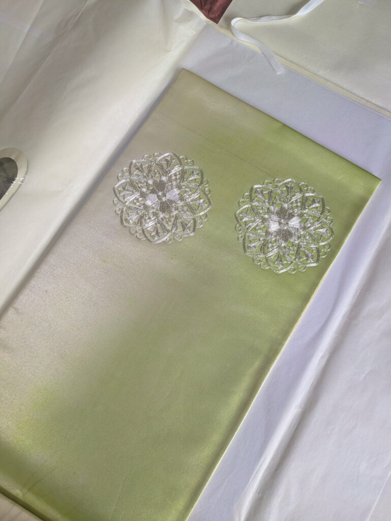 お太鼓の部分は細い銀糸をいくつも使って刺繍が施されています