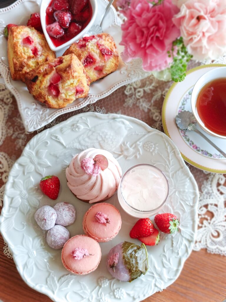 春もそろそろ終わりなので、春といえば!の桜といちごでアフタヌーンティーです